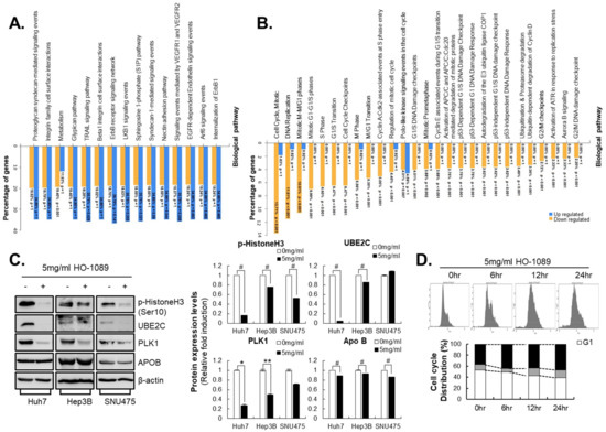 Suppression of mitosis-related protein induced by HO-1089 treatment: (A,B) The biological pathway of HO-1089 was analyzed using microarray analysis. Huh7 cells were treated with 5 mg/mL HO-1089 for 48 h. Cell cycle and mitosis-related gene expression were calculated and compared. The graphs show the percentages of genes that are not significantly changed (A), or significantly hanged (B), as well as their expression levels. (C) The genes from microarray analysis for which HO-1089 exposure changed the expression levels were examined in Huh7, Hep3B, and SNU475 cells (left panel). The Western blot images were quantitatively analyzed (right panel). (D) Cell cycle distributions induced by HO-1089 treatment in Huh7 cells were calculated at 0, 6, 12, and 24 h after treatment. Data are expressed as means ± SD (n = 3). * p < 0.05, ** p < 0.005, # p < 0.0005 compared to the control group.