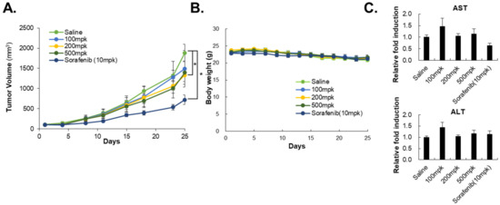 In vivo efficacy of HO-1089 treatment: (A) Tumor volume was calculated for 3 weeks, with HO-1089 treatment. Ten mpk sorafenib was used as a positive control. (B) Body weight was measured during the experimental period. (C) Liver toxicity present at the end of the in vivo experiment was examined using blood samples taken for the detection of AST and ALT levels. Relative fold induction was normalized to each control. Data are expressed as means ± SD (n = 7). * p < 0.05 compared to the control group.