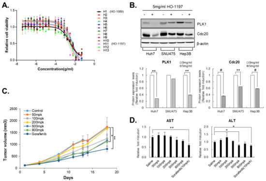 Key herbal combination, HO-1197, showed anticancer efficacy in HCC: (A) HO-1089 (H1) and 12 combinations of key ingredients including HO-1197 (H11) were used to treat HCC cells, from 50 mg/mL using 2-fold dilutions, for 48 h. Cell viability was measured using the counts of cell nuclei. (B) Expression levels of PLK1 and Cdc20 were examined in Huh7, Hep3B, and SNU475 cells after treatment with 5 mg/mL HO-1197 for 48 h (upper panel). The Western blot images were quantitatively analyzed (lower panel (C,D). In vivo efficacy of HO-1197 was examined using observation of changes in tumor volume (C) and liver toxicity (D) for 3 weeks. Data are expressed as means ± SD (n = 3). * p < 0.05, ** p < 0.005, # p < 0.0005 compared to the control group.