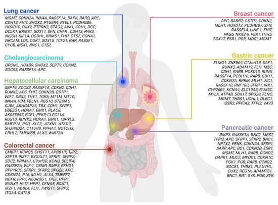| Review of the literature | Serum or plasma | / | Hyper and hypo | CDKN2A, CDKN2A/CDH1, CDH1, CDKN2A/CDH1/RARB, RUNX3, ZIC1, HOXD10, RUNX, RASSF1A, PCDH10, RPRM, MLH1, RASSF10, RNF180, SFRP1, IRX1, CYP26B1/KCNA4, SLC19A3, FAM5C/MYLK, ATP4B, XAF1, SOX17, SPG20, FLNC/THBS1/UCHL1/DLEC1OSR2/VAV3/PPFIA3, TFPI2 | [115] |