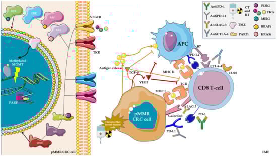 - Pietrantonio, F.; Morano, F.; Lonardi, S.; Raimondi, A.; Salvatore, L.; Marmorino, F.; Murgioni, S.; Pella, N.; Antonuzzo, L.; Ritorto, G.; et al. 383O MAYA Trial: Temozolomide (TMZ) Priming Followed by Combination with Low-Dose Ipilimumab and Nivolumab in Patients with Microsatellite Stable (MSS), MGMT Silenced Metastatic Colorectal Cancer (MCRC). Ann. Oncol. 2021, 32, S530–S531. [Google Scholar] [CrossRef]