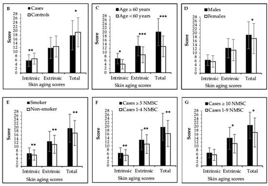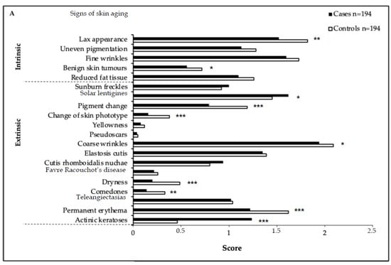 - Vierkotter, A.; Ranft, U.; Kramer, U.; Sugiri, D.; Reimann, V.; Krutmann, J. The SCINEXA: A novel, validated score to simultaneously assess and differentiate between intrinsic and extrinsic skin ageing. J. Derm. Sci. 2009, 53, 207–211. [Google Scholar] [CrossRef]