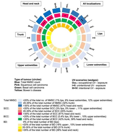 | UVR | Intentional and unintentional high UVR exposure | Vacation-related high intensity UVR * | Sunburns with blistering at age 20–39 Outdoor occupation: cSCC in the head/neck region BD on the lower extremities |