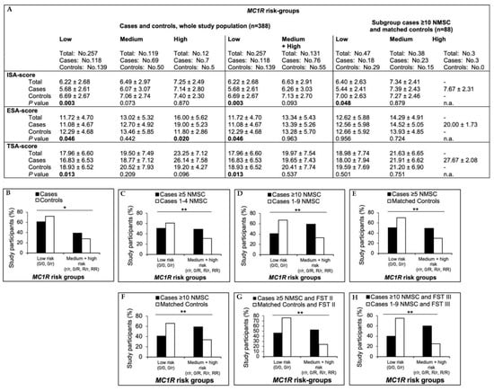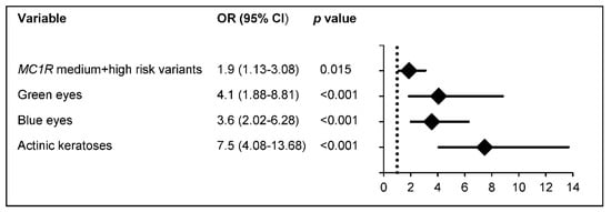 - Tagliabue, E.; Fargnoli, M.C.; Gandini, S.; Maisonneuve, P.; Liu, F.; Kayser, M.; Nijsten, T.; Han, J.; Kumar, R.; Gruis, N.A.; et al. MC1R gene variants and non-melanoma skin cancer: A pooled-analysis from the M-SKIP project. Br. J. Cancer 2015, 113, 354–363. [Google Scholar] [CrossRef] [PubMed]