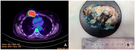 A positron emission tomography-computed tomography (PET-CT) image of the patient showed a right parasternal hypermetabolic rate tumor with thoracic wall and coastal invasion (A). The tumor shows a fleshy and greyish-white cut surface with a hemorrhage focus (B).