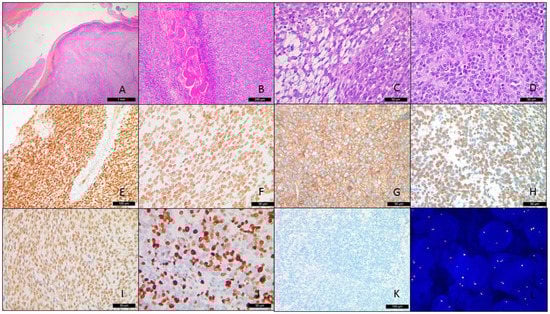 After the sectioning of 4 μm slides from formalin-fixed, paraffin-embedded (FFPE) blocks, deparaffinization in xylene, and rehydration in a series of decreasing concentrations of ethanol were performed. Antigen retrieval using either the Bond Epitope Retrieval Solution 1 (pH~6) or the Bond Epitope Retrieval Solution 2 (pH~9) (Leica Biosystems, Wetzlar, Germany) was carried out at 99–100 °C for 20–30 min. The slides were then treated with cytokeratin (1:450, clone OSCAR, Cell Marque, Rocklin, CA, USA), WT-1 (1:700, clone WT49, Leica Biosystems, Wetzlar, Germany), NUT (1:200, clone C52B1, Cell Signaling Technology, Danvers, MA, USA), CD56 (1:400, clone 123C3, DAKO, Agilent Technologies, Santa Clara, CA, USA), BCOR (1:400, clone bsb-128, Bio SB Incorporation, Goleta, CA, USA), CD99 (1:200, clone 12E7, DAKO, Agilent Technologies, Santa Clara, CA, USA), INSM1 (1:600, clone A-8, Santa Cruz Biotechnology, Dallas, TX, USA), NKX2.2 (1:400, clone EP336, Epitomics, Abcam, Cambridge, UK), SATB2 (1:200, clone EP281, Epitomics, Abcam, Cambridge, UK), TLE1 (1:450, 1F5, Cell Marque, Rocklin, CA, USA), SS18-SSX (1:400, clone E9X9V, Cell Signaling Technology, Danvers, MA, USA), Brg1 (1:150, clone GT2712, Thermo Fisher Scientific, Waltham, MA, USA), desmin (1:200, clone D33, DAKO, Agilent Technologies, Santa Clara, CA, USA), and MIB-1 (1:100, clone MIB-1, Dako, Agilent Technologies, Santa Clara, CA, USA) separately. Immunostaining was conducted with the Leica BOND-MAX™ autostainer and the peroxidase/DAB Bond™ Polymer Refine detection system (Leica Biosystems, Wetzlar, Germany) was utilized for visualization purposes.