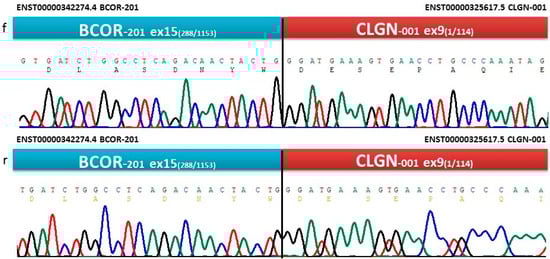 Bidirectional Sanger-sequencing electropherogram showing the nucleotide sequence at the breakpoint of BCOR-CLGN gene fusion. Note: f: forward direction, r: reverse direction.