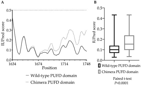 We used IUPred3 to predict the disorder propensities of the regions of the PUFD domain in the wild-type and chimera proteins (Figure 4A). We predicted a slight increase in the disorder propensity, but the PUFD domain was predicted to retain its structurally ordered nature in the chimera protein. This is in agreement with the results of the secondary structure prediction.