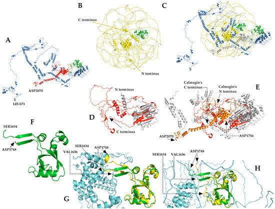 Structural comparison of the AlphaFold (AF) wild-type BCOR and calmegin protein with Robetta chimera protein, and a comparison of the wild-type experiment-determined PUFD domain with the AF- and Robetta-generated PUFD domains. (A): The Robetta-generated chimera protein (confidence: 0.28, range 671–2070, according to chimera numbering). The blue color indicates the amino acid sequence that corresponds to BCOR (between 671 and 1755 residues; the BCOR and chimera numbering is the same in this region) and the red color indicates the sequence corresponding to the calmegin protein (range 1756–2070, according to chimera numbering); the green color indicates the PUFD domain of BCOR (range 1634–1748, the BCOR and chimera numbering is the same in this region). (B): Proposed structure of the full-length BCOR protein downloaded from the AF database. The yellow color indicates the 1–1755 region of the chimera protein (being equivalent to the full-length BCOR protein), and the PUFD domain of BCOR is highlighted in green. (C): Aligned structures of the chimera and BCOR-aligned structure. (D): Structure of calmegin (total length 1–610), downloaded from AF database. The amino acid sequence corresponds to the chimera protein (from 1756 to 2070 residues). (E): Aligned structure of the chimera and calmegin proteins. Orange indicates the sequence of the chimera protein corresponding to calmegin. (F): Crystal structure of the PUFD domain of BCOR (from 1636 to 1748 residues; PDB ID: 4HPL). (G): Predicted structure of the PUFD domain in the chimera protein (Robetta, shown in yellow), aligned to the experimentally determined PUFD domain (PDB ID: 4HPL) (green). (H): Alignment of the BCOR’s PUFD domain structures, predicted by AF (yellow) and determined experimentally (PDB ID: 4HPL) (green). The light blue color indicates the non-PUFD domain residues of the chimeric protein (G) and AF-predicted BCOR protein (H).
