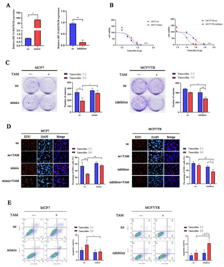 tRF-16-K8J7K1B promotes the tamoxifen resistance of breast cancer cells in vitro. (A) tRF-16-K8J7K1B was overexpressed or silenced by the transfection of respective vectors. RT-qPCR analyses revealed the relative expression of tRF-16-K8J7K1B and U6 in transfected cells. (B,C) The effects of tRF-16-K8J7K1B overexpression or knock down on the proliferation of MCF7 cells were examined by CCK-8 assay (B) and colony-formation assay (C). (D) EdU assays were used to detect the proliferation rates of MCF-7 cells after tRF-16-K8J7K1B was overexpressed or knocked down (E) Cells were treated with 4-OHT or ethanol (control), and flow cytometry was used to detect cell apoptosis in MCF7 and MCF7/TR cells. TAM: Tamoxifen; nc: negative control; mimic: tRF-16-K8J7K1B mimic; inhibitor: tRF-16-K8J7K1B inhibitor. Data are presented as mean ± SEM. * p < 0.05; ** p < 0.01; **** p < 0.0001. The scale bar represents 50 μm.