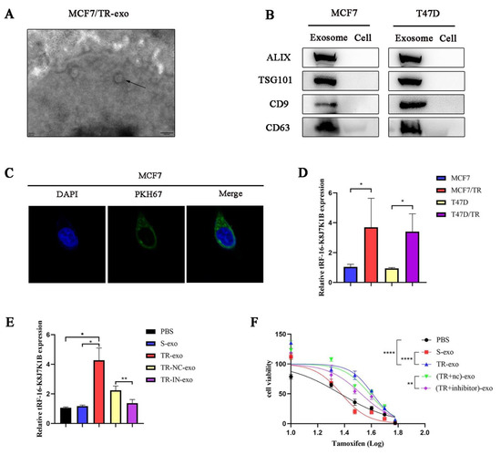 Exosomes mediate the delivery of tRF-16-K8J7K1B and promote tamoxifen resistance. (A) The morphology of exosomes derived from MCF7/TR cells under transmission electron microscope. The arrow indicated the exosomes. Scale bar, 200 nm. (B) Western blotting revealed the expression of exosome marker proteins ALIX, TSG101, CD9, and CD63 in suspension extracted by ultracentrifugation. (C) Laser confocal microscope revealed the uptake of PKH67-labeled exosomes (green fluorescence) derived from MCF7/TR cells by recipient cells. Cell nucleus was labeled with DAPI (blue fluorescence). (D) RT-qPCR analysis revealed the expression of tRF-16-K8J7K1B in exosomes derived from tamoxifen-sensitive cells and their respective resistant cells. (E) RT-qPCR detected the expression of tRF-16-K8J7K1B in recipient MCF7 cells that were treated with PBS, S-exo, TR-exo, NC-exo (TR-exo with tRF-16-K8J7K1B-nc), and IN-exo (TR-exo with tRF-16-K8J7K1B-inhibitor). (F) CCK-8 assay was performed to analyze tamoxifen sensitivity of MCF7/S cells after co-culturing with exosomes according to the indicated factors. Data are presented as mean ± SEM. * p < 0.05; ** p < 0.01; **** p < 0.0001. The uncropped blots are shown in Figure S4.