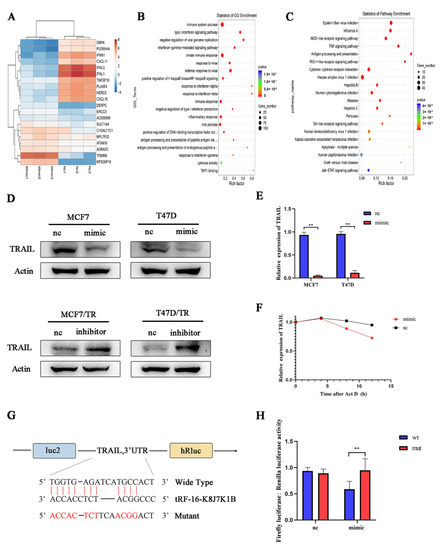 TRAIL is the target gene of tRF-16-K8J7K1B. (A) Heat map shows the change in mRNA expression in tRF-16-K8J7K1B-overexpressed MCF7 cells compared with the control group. (B) GO analysis and (C) KEGG analysis indicate the enriched pathways by the target genes of tRF-16-K8J7K1B. (D) Western blotting and (E) RT-qPCR revealed the expression of TRAIL in MCF7 and T47D cells transfected with tRF-16-K8J7K1B mimic or control. (F) RT-qPCR detected the expression of TRAIL in MCF7 cells after 0, 4, 8, and 12 h of ACTD treatment. (G) The predicted tRF-16-K8J7K1B binding site in TRAIL. (H) Luciferase reporter assay was performed to detect the luciferase activity of WT or MUT TRAIL 3′ UTR after co-transfection with tRF-16-K8J7K1B mimics or negative control. Data are presented as mean ± SEM. ** p < 0.01. The uncropped blots are shown in Figure S4.