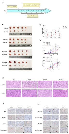 Exosomal tRF-16-K8J7K1B promote tamoxifen resistance in vivo. (A) Schematic diagram of animal experiment. (B) After exosomes and tamoxifen treatment, tumors isolated from mice are shown in images. (C) Tumor weight at the endpoint. (D) Tumor volume changes during our study. (E) Tumor tissue slices were stained with hematoxylin-eosin. (F,G) Immunohistochemistry analyses of the expression of TRAIL, cleaved caspase 3, and Ki67 in tumor tissues. The red arrows indicate the positive immunohistochemical reactions. S-exo: exosomes derived from tamoxifen-sensitive cells; NC-exo: exosomes derived from tamoxifen-resistant cells transfected with tRF-16-K8J7K1B NC; IN-exo: exosomes derived from tamoxifen-resistant cells transfected with tRF-16-K8J7K1B inhibitor; C-CAS3: cleaved caspase 3. Scale bars: 50 μm. Data are presented as mean ± SEM. * p < 0.05; *** p < 0.001; **** p < 0.001; ns: no significance.