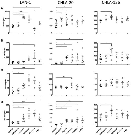 Figure 4B–D). Interestingly, all chemotherapeutics except carboplatin significantly increased ULBP-2 and MICA/B in CHLA-20 and in LAN-1 (up to 4.5- (vincristine) and 3.3- (etoposide) and up to 9- (cisplatin) and 4.5-fold (cyclophosphamide). We mainly observed effects on ULBP3 abundance after cisplatin, etoposide, and vincristine treatment (up to 3.6-fold increase).