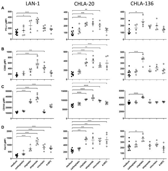 Figure 5). In LAN-1, etoposide showed the strongest effects on all checkpoint ligands analyzed (2.6-, 4.1-, 3.3-, and 5.2-fold increase for PD-L1, CD86, CD155, and Gal-9,