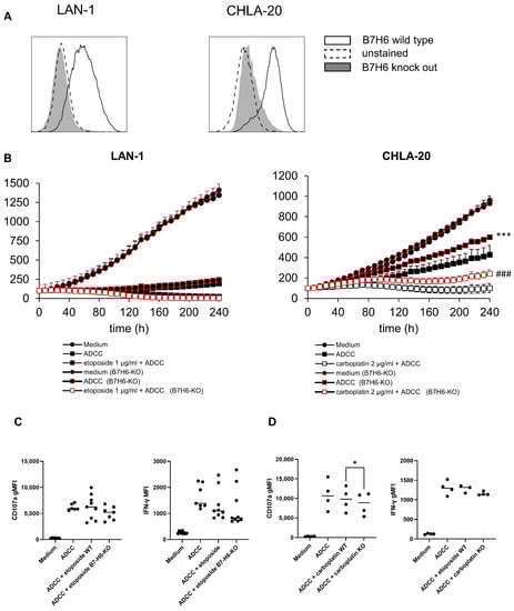 Figure 7C,D). Indeed, the activation of NK cells against LAN-1 with B7-H6-KO was markedly, but not significantly, decreased, and against CHLA-20, B7-H6-KO was significantly reduced (