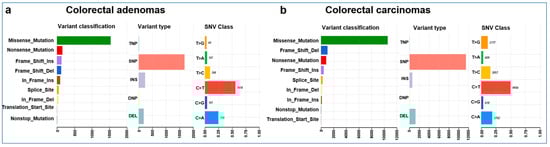 Summary plots of the variants found in colorectal adenomas (a) and carcinomas (b). Variant classification distribution: the X-axis represents the number of variants, and the Y-axis represents the variant type categories. Variant type plot: the X-axis represents the number of variants, and the Y-axis represents the variant type categories and SNV class plot.