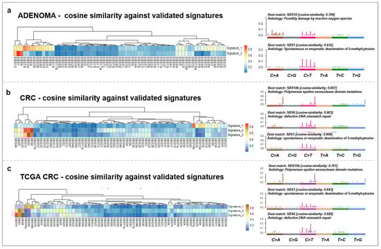 Somatic mutation signatures of the adenomas (a) and carcinomas of our cohort (b) and the TCGA COAD + READ CRC (c) dataset. The left panels represent the signatures retrieved from the analyzed groups and their similarity to the COSMIC v3.2 SBS signatures on heatmaps. The right panels show the characteristic signatures of the datasets and the proposed etiology of the SBS signatures.