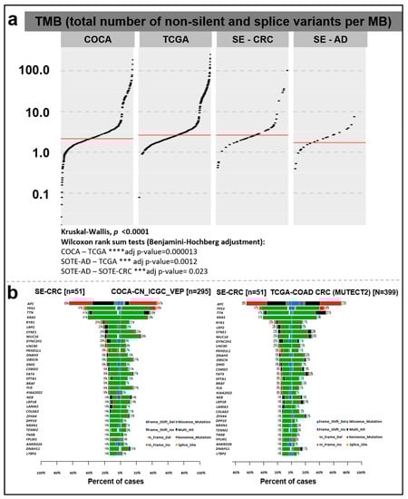 There was a significant difference in TMB between the COCA–TCGA, SE-AD–TCGA, and SE-AD–SE-CRC groups. In our cohort, CRC samples showed a relatively higher somatic mutation rate (median = 2.605 total/Mb) compared to AD tissue samples (median = 1.71 total/Mb) (Figure 3).