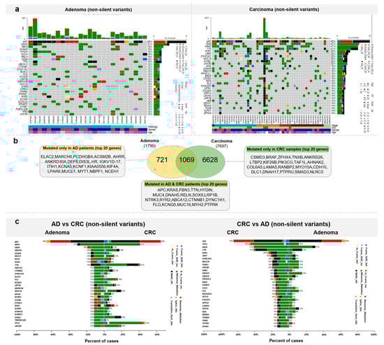 Somatic mutation landscape of colorectal tumors. (a) Most frequently mutated genes in adenomas and CRCs (b) Venn diagram representation of the number of genes mutated exclusively in one sample group or in both ADs and CRCs with the list of the 20 most frequently mutated genes. (c) Direct comparison of AD and CRC samples based on the top 20 most frequently mutated genes in AD (left) and CRC (right).