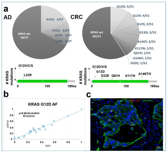Among 27 ADs and 51 CRCs, KRAS mutation could be detected in 8/27 and 21/51 (0.41) of the analyzed patients, respectively. KRAS variant distribution was different in the case of benign and carcinoma samples. Advanced ADs (with size ≥10 mm and/or high-grade dysplasia and/or villous structure) showed KRAS mutation in 6/13 of the cases compared to 2/14 of early ADs. Overall variants in codon 12 (detected in AD:8/27, CRC: 11/51 (0.216) patients) and 13 (CRC: 3/51 (0.06)) were the most frequent in our samples with G12V (5/27 patients) dominance in adenomas and G12D (5/51 (0.098) patients) in CRC cases. Mutations outside of these codons were observed in adenomas (L23R 1/27 patients) and with a higher presence in CRC cases (A146T, K117N, Q61H, A146V, D33E 1/51 (0.019) patients) (Figure 5a).