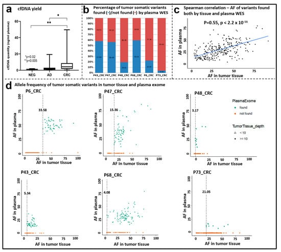 Comparison of tissue and plasma exome sequencing data. (a) cfDNA quantity (ng/mL plasma) in the NEG, AD, and CRC groups. Boxplot whiskers represent 2.5–97.5 percentiles, and the center line represents the median. * p < 0.02, ** p < 0.005. (b) Percentage of tumor somatic variants found/not found by plasma cfDNA WES. (c) Correlation of the allele frequency data of somatic variants detected both in tissue and plasma samples by WES. Spearman correlation ρ = 0.55, p < 2.2 × 10−16. (d) Allele frequency of variants detected in tissue and plasma samples; dots (•) represent variants with ≥10 coverage; triangles (∆) represent variants <10 coverage in the tissue samples.