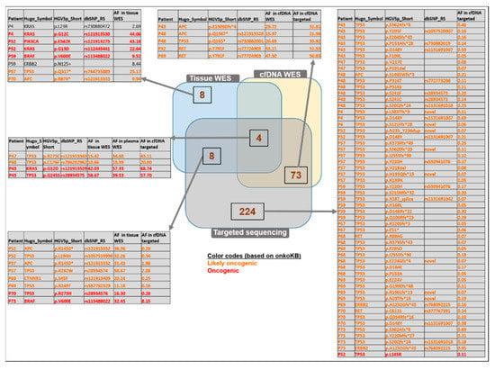 Among the 224 variants exclusively observed by the targeted panel method, 53 likely oncogenic and one oncogenic variants (TP53 p.L145R) were identified. Most of the 73 variants detected in plasma with both WES and targeted panel sequencing were found also in the normal tissue samples; therefore, these might potentially be germline variants. Interestingly, a subset of variants was observed only in the cfDNA samples but not in the tissue samples (three likely oncogenic: APC p.E1309Dfs*, APC p.Q1367*, TP53 p.Q165*; one likely neutral: ERBB2 p.P1170A; Figure 7, intersection of the cfDNA WES and the targeted sequencing results).