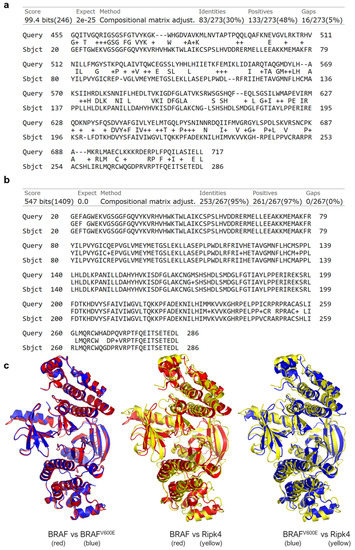 Figure 1a shows the result of comparing two sequences of amino acid sequences: BRAF and RIPK4. The compared sequences contain the regions of the kinase domains, which, according to the UniProt database, in the case of BRAF kinase is located at positions 457–717 of amino acids in the peptide sequence, whereas in the RIPK4 protein, this region falls between 22–286 amino acid positions. In BLAST, these regions were extended with two amino acid residues (region 455–717 in the BRAF protein (Query) and 20–286 in the RIPK4 protein (Sbjct), as seen in Figure 1a). Comparative analysis showed 30% identity in amino acid sequence between human RIPK4 (UniProt: Q2TB16) and human BRAF (UniProt: P15056), and 95% sequence identity in the kinase region between human RIPK4 (UniProt: Q2TB16) and mouse Ripk4 (UniProt: Q9ERK0) (Figure 1c) and 90% in full-length proteins (Supplementary Data, Figure S2) [40]. The crystallized form of human RIPK4 is not present. Therefore, in our study we used the crystallized structure of the mouse Ripk4 protein. We found that despite of 30% sequence identity, the murine Ripk4 protein (PDB: 5WNI) is structurally highly similar to the wild-type human BRAF protein (PDB: 5CSW) and BRAFV600E mutant (PDB: 4XV2), with root mean square deviation (RMSD) values of 2.493 Å and 2.483 Å, respectively (Figure 1b).