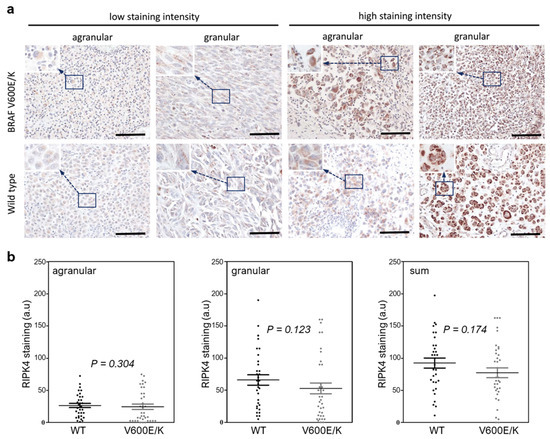 As in our previous work, we observed two different types of staining within the cytoplasm, agranular and granular, both with different intensities (Figure 2a,b). We did not observe statistically significant differences in the RIPK4 protein expression in metastatic melanoma between those with or without BRAF mutations (Figure 2b).