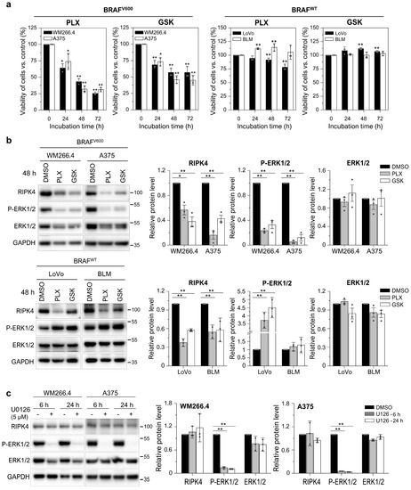BRAF inhibitors decrease the level of the RIPK4 protein in BRAFV600 and BRAFWT cells. (a) Viability of melanoma cells (A375, WM266.4, BLM) and LoVo cells treated with vemurafenib (PLX; 10 µM) and dabrafenib (GSK; 10 nM) at 24–72 h using the MTT assay. (b,c) Western blot images showing the levels of P-ERK1/2, ERK1/2 and RIPK4 proteins in cells after treatment with (b) vemurafenib (PLX; 10 µM) and dabrafenib (GSK; 10 nM) for 48 h or (c) U0126 (5 µM). GAPDH is the loading control. Each bar represents the mean ± SD of three biological replicates. Statistical analysis was performed using the Student’s t test. * p < 0.05 and ** p < 0.01 were considered significant.