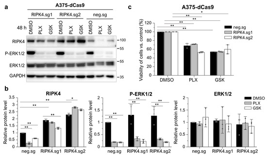 Furthermore, to confirm that BRAFi act on RIPK4 independently of their effect on ERK1/2 activation, we overexpressed RIPK4 in A375 cells and further treated these cells and the respective negative control with drugs. The results show that the inhibitors do not affect RIPK4 levels in cells with RIPK4 overexpression, although they block ERK1/2 activity (Figure 4). This confirms that the decrease in RIPK4 levels was due to interaction with the inhibitor rather than negative feedback mechanisms, which further supports the results obtained on BRAFWT cells. Furthermore, overexpression of RIPK4 does not reduce the BRAFi efficacy, as indicated by a similar decrease in ERK1/2 activation (Figure 4a,b) and the cell viability of cells with overexpression (RIPK4.sg1, RIPK.sg2) compared to controls (neg.sg) measured at 24 h using the MTT assay (Figure 4c).