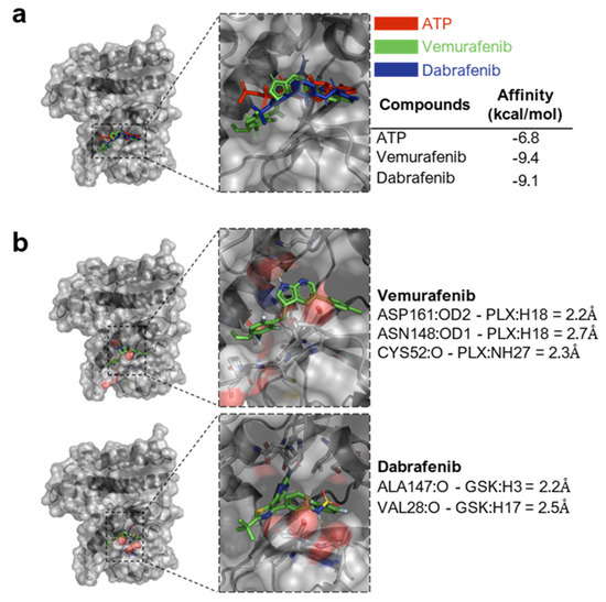 Inhibitors of the BRAFV600 protein can directly interact with the RIPK4 kinase. (a) Molecular docking of ATP, vemurafenib, and dabrafenib binding to RIPK4. RIPK4 was shown in cartoon style (with Connolly surface), while the analyzed ligand was shown in the stick model. The energy of affinity for vemurafenib, dabrafenib, and ATP to RIPK4 is −9.4; −9.1; −6.8 kcal/mol, respectively, for these inhibitors. (b) Potential hydrogen bonds between the RIPK4 ligand molecule and the protein.