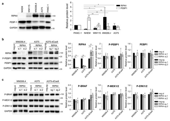 The level of PEBP1 protein may be regulated using the RIPK4 kinase [24]. Since PEBP1 acts as a tumor suppressor in melanoma [30], we investigated a correlation between the levels of RIPK4 and PEBP1 protein levels in melanoma. The RIPK4 and PEBP1 protein in melanoma cell lines were compared to the levels in normal melanocytes. The comparative analysis showed an inverse relationship. Melanocytes in which RIPK4 kinase expression is not observed have the highest levels of PEBP1 protein expression among the cell lines analyzed. PEBP1 protein levels decreased by 61% (p < 0.05) in the WM115 cell line derived from the primary lesion, while a threefold increase in RIPK4 expression is observed in the same cells. A significant decrease (about 75% (p < 0.05) in PEBP1 expression was observed in the WM266.4 and A375 cell lines, showing the highest levels of RIPK4 (Figure 6a). Therefore, we ask whether the downregulation or overexpression of RIPK4 affected PEBP1 levels in the WM266.4 and A375 cells. The downregulation of RIPK4 using siRNA had no effect on phospho-PEBP1 or on PEBP1 degradation in both cell lines. Furthermore, siRIPK4 did not alter the BRAF/MEK/ERK pathway (Figure 6b,c). Next, we examine whether the overexpression of RIPK4 would reduce the level of phosphorylated PEPB1. For this purpose, we chose A375 cells, characterized by lower levels of RIPK4 than WM266.4, but a similar level of PEPB1. We increased the RIPK4 levels in A375 cells using the CRISPR/Cas9 system and two guide RNAs. However, the upregulation of RIPK4 had no effect on PEBP1 phosphorylation or PEBP1 degradation compared to the negative Cas9 control and did not alter the BRAF/MEK/ERK pathway (Figure 6b,c).
