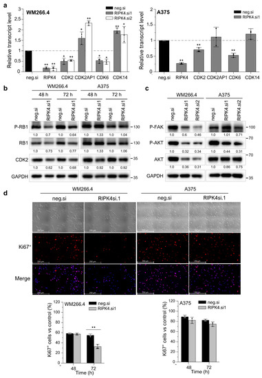 Moreover, we tested whether the downregulation of RIPK4 expression affects the level of phosphorylated AKT and FAK proteins, which are also known to be able to control cell proliferation. Figure 7c illustrates that the downregulation of RIPK4 decreases the activity of AKT and FAK levels in WM266.4 while it has no effect on A375 melanoma cells.