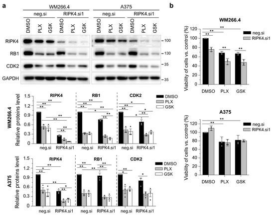 Downregulation of RIPK4 enhanced the effect of BRAFi on WM266.4 cell proliferation but does not A375. WM266.4 and A375 cells were transfected with RIPK4.si1 or neg.si RNA. After 48 h of transfection, cells were incubated with vemurafenib (PLX; 10 µM), dabrafenib (GSK; 10 nM), or DMSO, as a control, for 24 h. (a) The expression levels of the RIPK4, RB1, and CDK2 proteins were analyzed using Western blotting along with densitometry. GAPDH was used as a loading control. (b) Viability of the cells was assessed with MTT assay. Each bar represents the mean ± SD of three biological replicates. The samples were compared with the neg.si control treated with DMSO. * p < 0.05, ** p < 0.01.