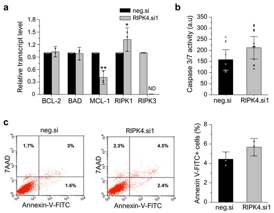 After showing that the silencing of RIPK4 inhibits the proliferation of WM266.4 cells, we next examined whether this effect is due to an induction of apoptosis or necroptosis in cells. Interestingly, although the downregulation of RIPK4 leads to a 30% increase in mRNA levels for RIPK1, the mRNA levels for RIPK3 are below the detection threshold in both the RIPK4.si1- and neg.si-transfected cells, indicating that RIPK3 is not expressed in WM266.4 cells (Figure 9a), suggesting that these cells are resistant to necroptosis. We did not observe differences in the levels of the transcripts encoding BCL-2 and BAD, regulatory proteins, in cells 48 h after transfection with RIPK4.si1 versus neg.si (Figure 9a). However, an examination of the MCL-1 transcript level revealed a significant decrease in this transcript (approximately 60%) compared to the control. These observations were accompanied by a small and non-statistically significant increase in caspase activity 3/7 (approximately 34%) (Figure 8b) and the percentage of apoptotic cells (5.7% vs. 4.4% in scrambled control) as determined via the Annexin V/7AAD double staining of cells (Figure 9c, the raw data file) 72 h after transfection.