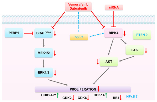 RIPK4 kinase has oncogenic functions in melanoma and shows high similarity to BRAF protein, making this kinase sensitive to the BRAF inhibitors vemurafenib and dabrafenib. BRAFi downregulates RIPK4 in both BRAF-mutated and wild-type cells. Although downregulation and upregulation of RIPK4 does not affect signal transduction through the BRAF/MEK/ERK pathway in melanoma, it can inhibit cell proliferation and the FAK/AKT pathway.