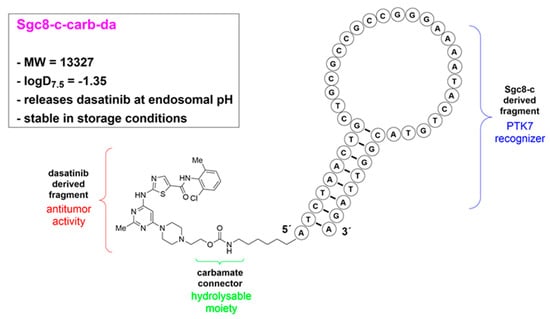 Schematic representation of Sgc8-c-carb-da structure and characteristics. Fragments correspond to anti-tumour activity (dasatinib-derived moiety), target recognition (Sgc8-c-derived fragment), and carbamate connectors (hydrolysable at endosomal pH []).