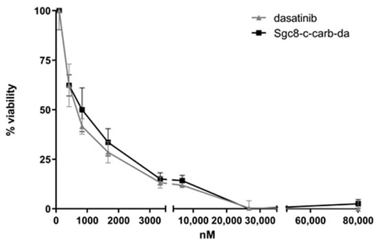 To further test whether Sgc8-c-carb-da activity was the result of each component of the hybrid agent (i.e., dasatinib and Sgc8-c), the cytotoxicity of Sgc8-c was also evaluated, being higher than 80,000 nM (Table 1, Figure S1A in Supplementary Materials). These results clearly showed that the Sgc8-c-carb-da cytotoxic activity against A20 lymphocytes is the result of the dasatinib component since the truncated aptamer Sgc8-c did not display cytotoxic activity in the experimental assayed conditions. Hence, Sgc8-c was not included in the following mechanistic experiments.