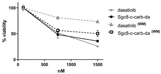 To study the role of Sgc8-c as a delivery system, we used an adaptation of a previously described Washing Method (WM) [], which mimics the in vivo conditions. Cells were incubated with the studied agents (Sgc8-c-carb-da, Sgc8-c, or dasatinib) for 30, 60, or 120 min to allow specific binding to PTK-7. Afterward, the media was removed, and the cells were washed with PBS. Then, cells were incubated at 37 °C in the corresponding culture medium for up to 48 h. The MTT assay was developed as described above.