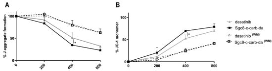 Changes in mitochondrial membrane potential induced by Sgc8-c-carb-da. Quantification of the JC-1 assay obtained from incubation of the A20 cell line with 200, 400, and 800 nM of dasatinib or Sgc8-c-carb-da for 24 h, with (WM) or with the washing method (60 min of drug exposure followed by a wash and further incubation). (A) Percentages of J-aggregate formation and (B) percentages of JC-1 monomer retention are shown. Graph shows mean ± SD, n = 3 per condition. * p < 0.05 (Student’s t-test).