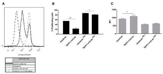 The percentage of proliferating cells was lower, and concordantly, the CFSE mean fluorescence index (MFI) was higher after treatment with 800 nM Sgc8-c-carb-da than dasatinib for 48 h (Figure 6B,C). Likewise, when A20 cells were incubated for 60 min (washing method), Sgc8-c-carb-da promoted a higher cell arrest than dasatinib, with the percentage of proliferative cells being 81.0% and 87.0% for Sgc8-c-carb-da and dasatinib, respectively (Figure 6B). These observations could be explained by the ability of the aptamer to interact with PTK7 and facilitate the delivery of dasatinib intracellularly, arresting cell proliferation.
