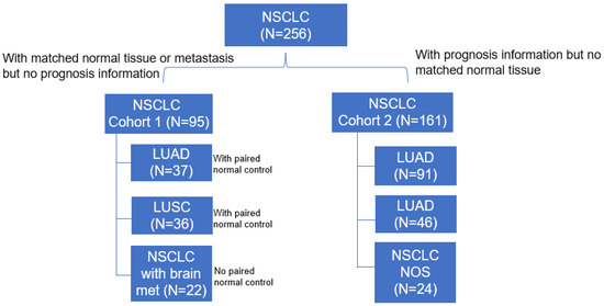 Figure 1 summarizes all the 256 NSCLC cases included in this study. Cohort 1 contained TMA samples from 95 NSCLC patients, which included 37 LUAD with matched non-cancerous controls, 36 LUSC with matched non-cancerous controls, and 22 NSCLC cases with brain metastases. Cohort 2 had tumor tissue samples from 161 NSCLC patients, which included 91 LUAD, 46 LUSC, and 24 cases with unspecified histology types. The patient demographics and tumor characteristics for cohort 1 and cohort 2 are summarized in Table S1 and Table S2, respectively.