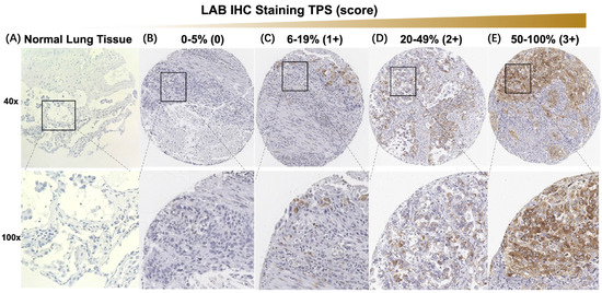 Atlas of LAB expression by IHC. (A) Representative pictures of LAB stain in normal lung tissue. (B–E) Atlas of representative pictures of 0, 1, 2, and 3 IHC scores for LAB expression in NSCLC TMAs. Abbreviations: LAB, labyrinthin; IHC, immunohistochemistry; NSCLC, non-small-cell lung cancer; TMA, tissue microarray; TPS, tumor proportion score.