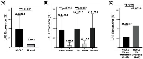 LAB expression and NSCLC metastasis. (A) Increased LAB expression was detected in NSCLC compared to matched, non-cancerous tissues. (B) Increased LAB expression was detected in LUAD and LUSC compared to matched, non-cancerous tissues, and brain metastasis. (C) Higher LAB expression was associated with NSCLC metastasis. ** p < 0.01 and *** p < 0.001 for statistical significance.