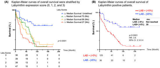 Slides were prepared by first cutting FFPE tissue sections (4-μm) from each TMA. Slides were then deparaffinized and antigen retrieval performed with heat-induced-epitope-retrieval solution (pH 9) (DAKO, Agilent, Santa Clara, CA, USA). Subsequently, slides were incubated in dual endogenous enzyme block (DEEB) blocking solution in a DAKO Autostainer. TMA slides were immunolabeled by IHC for LAB expression using LAB antibody MCA 44-3A6. MCA 44-3A6 is a mouse monoclonal anti-labyrinthin antibody that was produced using the standard hybridoma technology (HB-8986TM, ATCC, Manassas, VA, USA) [3,4]. The slides were incubated with the hybridoma supernatant containing MCA 44-3A6 for 60 min, washed with PBS, then visualized by EDL solution (DAKO EnVision and Dual Link System-HRP). All slides were counterstained with hematoxylin. IHC slides were scored by two blinded readers (WM and JZ) and verified by two pathologists (WM and CZ) blinded to clinicopathologic information. LAB protein expression was quantified using the percentage of positive cells. A scale of increasing LAB expression was defined as 0 (0–5%), 1+ (6–20%), 2+ (21–50%), and 3+ (51–100%). A tumor proportion score (TPS) was also calculated as the percentage of viable tumor cells showing partial or complete membrane staining at any intensity. The specimen was considered to have positive LAB expression if TPS > 5% and negative LAB expression if TPS ≤ 5%.