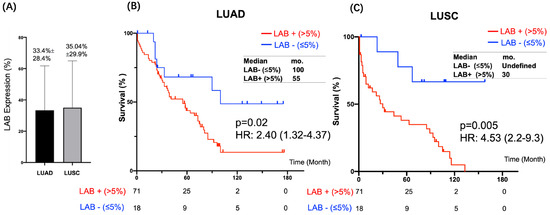 LAB expression in histology subtypes of NSCLC. (A) The median LAB expression was higher in LUSC than LUAD. Kaplan–Meier curves of overall survival were stratified by LAB expression (negative vs. positive) in LUAD (B) and LUSC (C), respectively.