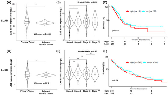 LAB RNA expression in TCGA. Average LAB exon RNA expression was assessed in the TCGA LUAD. Violin plots of average LAB expression in LUAD by tissue type (A) or cancer stage (B). Pairwise statistical differences assessed by Wilcoxon rank sum test (Mann–Whitney U test) and one-way ANOVA by Kruskal–Wallis tests. (C) Kaplan–Meier curves depicting overall survival or patients with higher median LAB RNA expression. Number at risk table shown below. Log-rank test used to evaluate significance. Same analyses applied to TCGA LUSC (D–F). * p < 0.05 and *** p < 0.001 for statistical significance. ns for no statistical significance.