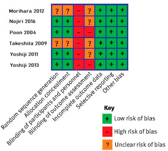 The six RCTs were assessed with the Cochrane tool (Figure 2). All studies had a high risk of performance bias and a high or unclear risk of detection bias. Risk for other types of bias were overall low.