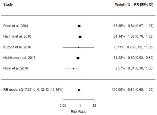 A meta-analysis of these five studies was performed (Figure 4). There was no statistically significant difference in mortality rates between the two groups (RR = 0.81, 95% CI: 0.65–1.02), with a tendency for lower rates in the BCAA group. Heterogeneity among studies was moderately high (I2 = 45.2%).